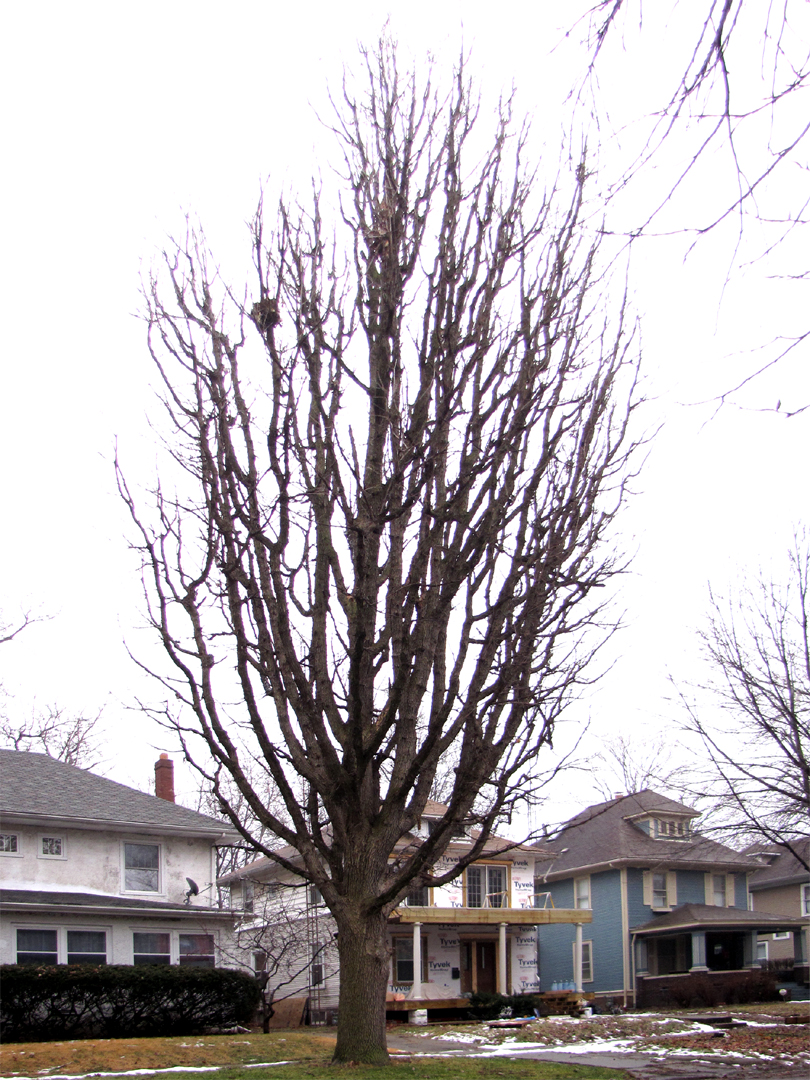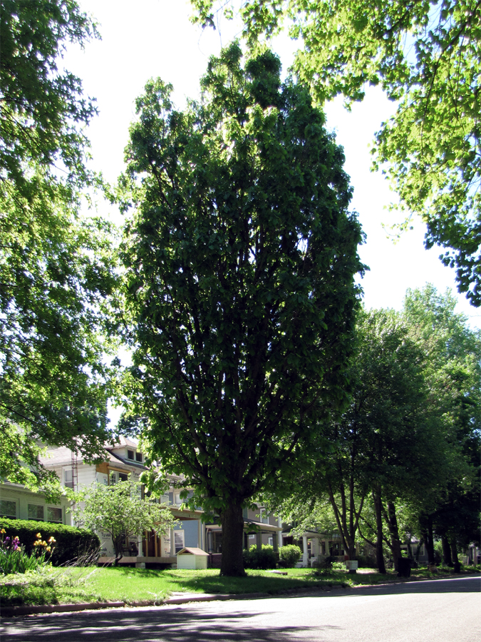 Deciduous tree selected for its fastigiate growth form. Leaves, bark, stems typical of species. 20 x 5 m. Plant may be sterile. No fruit set observed over last several seasons.